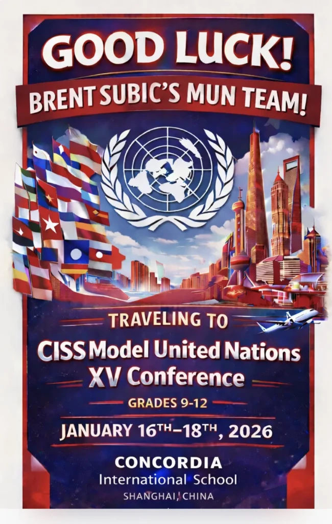 Good luck to our MUN team as they travel to China to represent our school at the CISS Model United Nations XV Conference. The conference will take place from January 16–18, 2026, at Concordia International School in Shanghai, bringing together student delegates from around the world. We are proud of our delegates and wish them a rewarding, educational, and successful experience on the global stage.